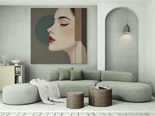 Een stijlvol en modern kunstwerk dat rust en elegantie uitstraalt. Het vrouwelijke profiel is strak vormgegeven in zachte aardetinten en minimalistische lijnen. De serene uitstraling en het subtiele kleurgebruik maken dit schilderij ideaal voor interieurs met een natuurlijke, warme of moderne stijl. Perfect als eyecatcher in woonkamer, slaapkamer of stijlvolle ontvangstruimte.