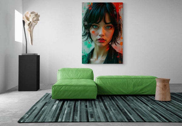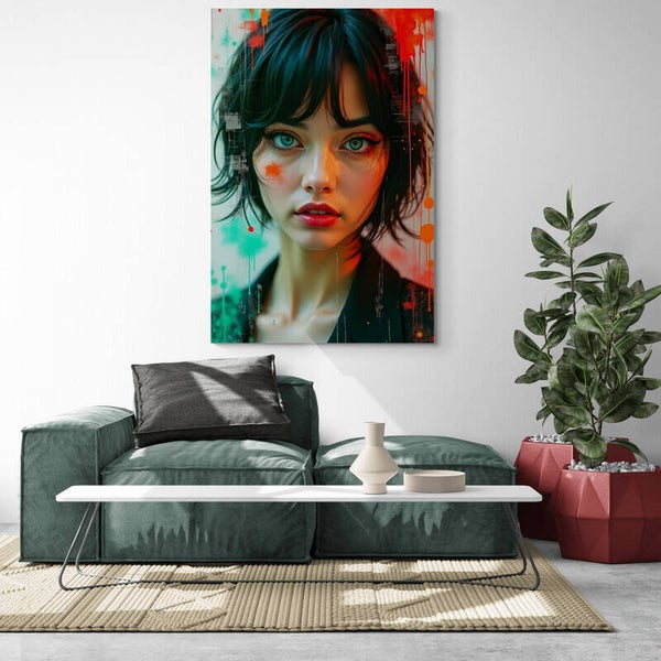 Een krachtig en modern kunstwerk met een indringend portret dat meteen de aandacht trekt. De expressieve achtergrond is bewerkt met kleurrijke verfspatten in oranje, rood en groen, wat het geheel een dynamische en artistieke uitstraling geeft. Perfect als statement piece in een eigentijds interieur of creatieve ruimte.