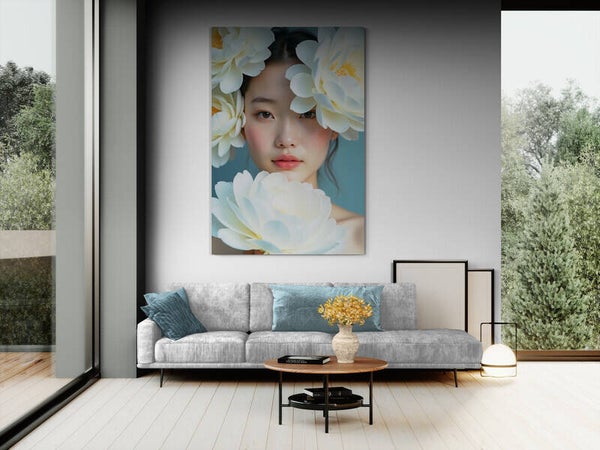 Een elegant en modern kunstwerk met een serene uitstraling. Het zachte portret wordt omlijst door grote, witte lotusbloemen die symbool staan voor puurheid en rust. De subtiele pasteltinten en het zachte licht geven dit schilderij een dromerige en verfijnde uitstraling. Perfect als stijlvolle wanddecoratie voor een rustige en elegante woonruimte.
