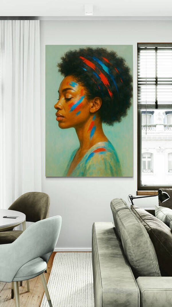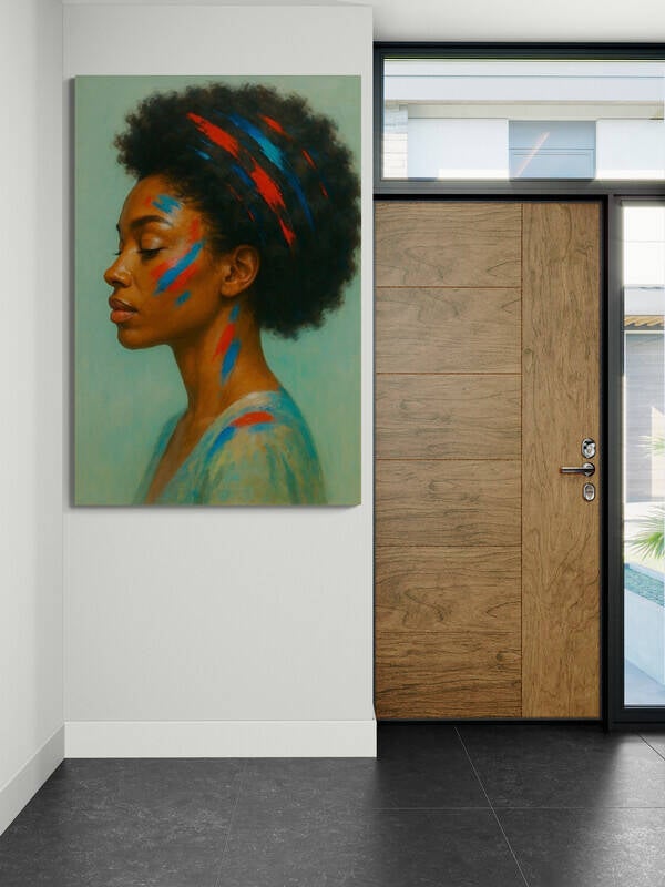 Een modern en artistiek portret in schilderachtige stijl met expressieve penseelstreken in helderblauw en oranjerood. De rustige houding in combinatie met de levendige verfaccenten zorgt voor een krachtig contrast tussen sereniteit en creativiteit. Dit kunstwerk is perfect als statement piece en voegt karakter en diepte toe aan elke ruimte.