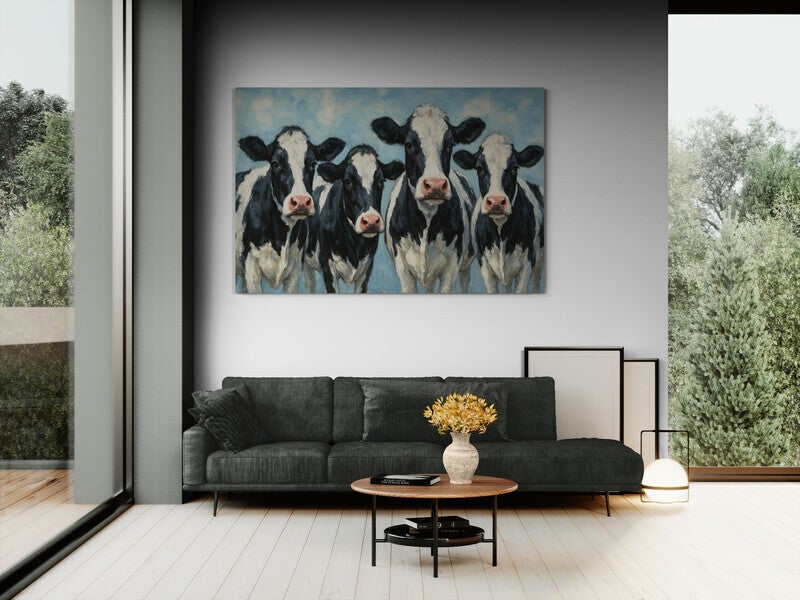 Luchtig Blikveld is een kunstwerk dat rust en vrolijkheid uitstraalt. Vier zwart-witte koeien staan frontaal afgebeeld tegen een heldere blauwe lucht. De penseelstreken geven het geheel een geschilderde, bijna impressionistische stijl. Deze combinatie van boerderijleven en moderne schildertechniek zorgt voor een sfeervol geheel, perfect voor landelijke keukens, eetkamers of moderne boerderij-interieurs.
