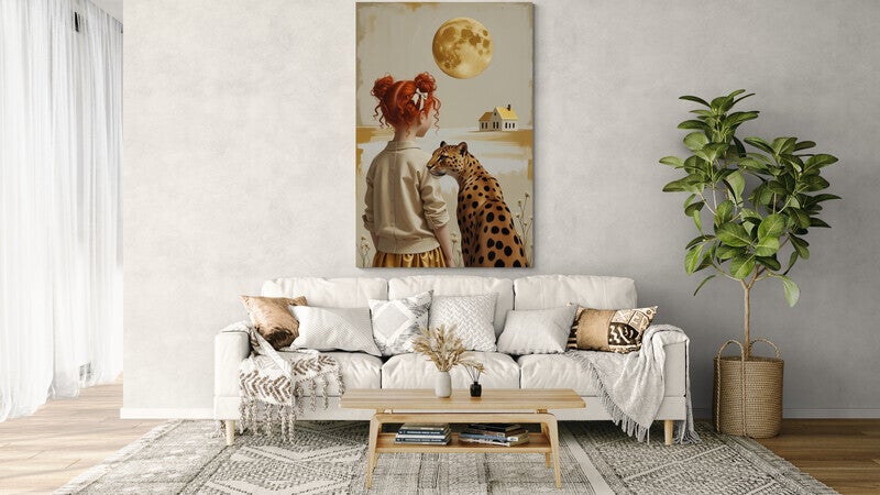 Een roodharig meisje kijkt uit over een surrealistisch maanlandschap, haar blik gericht op een gele maan die groot en stil aan de hemel hangt. Naast haar staat een sierlijke jachtluipaard, alert maar vredig. Een huisje in de verte versterkt het gevoel van afstand en dromerige stilte. Een verstild werk dat tegelijk kracht en kwetsbaarheid uitstraalt.