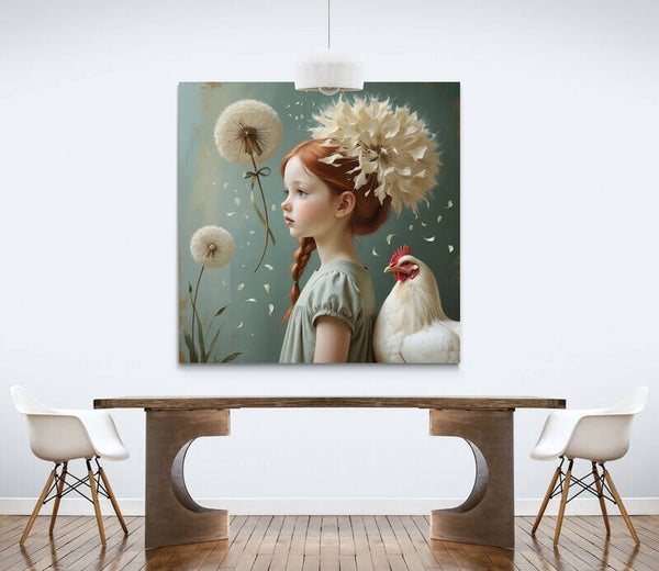 Dit kunstwerk vangt een moment van verstilling vol symboliek. Een roodharig meisje staat zijwaarts, met een majestueuze bloemkroon van paardenbloemzaadjes in haar haar. Op haar schouder zit een witte kip, als zachte metgezel. Losse pluisjes dwarrelen als verstrooide gedachten door de lucht.