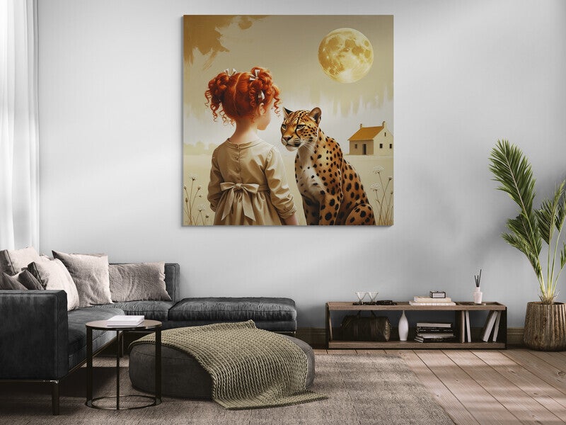 Een intens stil moment tussen een meisje en een luipaard, gevangen in een landschap dat baadt in goud. De volle maan straalt helder boven een eenzaam huis. Een krachtig maar teder kunstwerk dat uitnodigt tot interpretatie – over vertrouwen, natuurkracht en innerlijke rust.