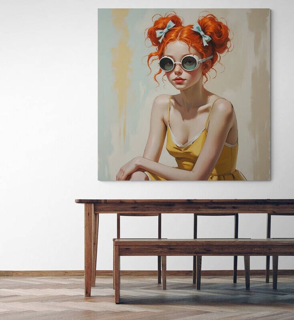 Een jong meisje met felrood haar, turquoise strikken en een stralend gele jurk zit ontspannen in het zonlicht. Haar witte zonnebril weerspiegelt de rust van een zomerse dag. Dit schilderij straalt energie, frisheid en vrouwelijke kracht uit – perfect voor wie zijn interieur een zonnige boost wil geven.