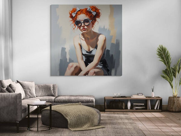 Een krachtig en expressief schilderij van een roodharig meisje met twee speelse knotjes, zilveren strikjes en een oversized retrobril. Ze draagt een strakgrijze jurk en zit tegen een abstract geschilderde achtergrond vol contrast en energie. Dit kunstwerk combineert mode, lef en een vleugje nostalgie – perfect voor moderne interieurs die durven op te vallen.