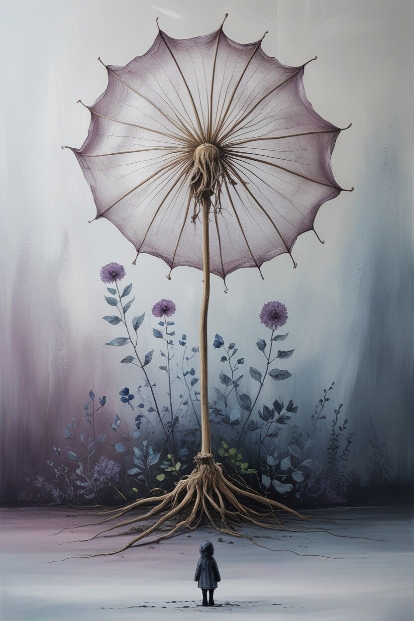 Een dromerig schilderij waarin een klein kindfiguur stilstaat onder een immense berenklauw, waarvan de wortels zich als een dansend web over de aarde spreiden. De achtergrond is opgebouwd in zachte lilatinten met weelderige bladeren en bloemen, wat het beeld iets magisch geeft. Het kind in donkere jas benadrukt de stilte en verwondering. Een uniek kunstwerk dat perfect past bij interieurs die rust en poëzie willen uitstralen.