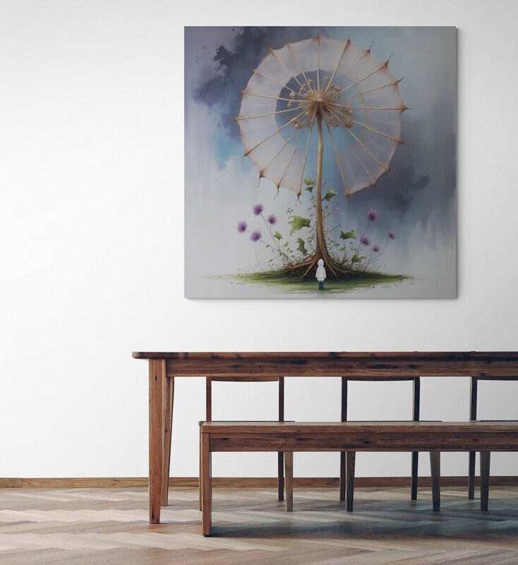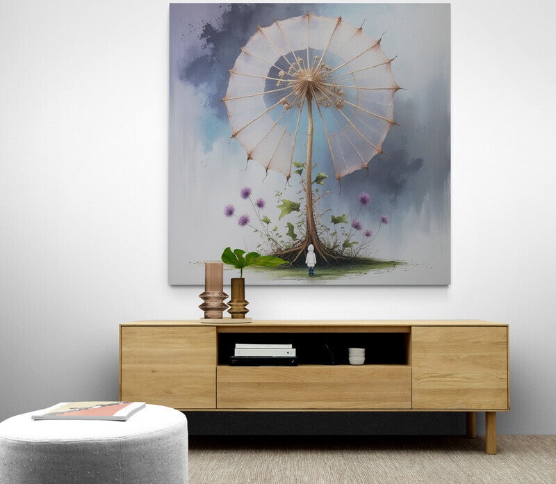 Een betoverend kunstwerk waarin een kind in witte jas uitkijkt naar een immense bloemvorm met ragfijne bladeren, als een natuurlijke parasol vol verstilling. De grote berenklauw-achtige bloem staat midden in een landschap vol paarse bollen en groen blad. Dit schilderij roept een gevoel van verwondering op, alsof je door de ogen van een kind kijkt naar de poëzie van de natuur. Ideaal voor een interieur dat zoekt naar verstilling, diepgang en een artistiek gebaar aan de muur.