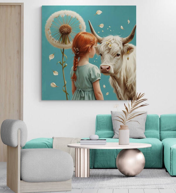 Een dromerig kunstwerk waarin een meisje met rood haar oog in oog staat met een witte hooglander. De setting is betoverend: een grote paardenbloem, zachte bloemblaadjes in de lucht, en een gevoel van stilte dat voelbaar is. Dit schilderij brengt een subtiele magie in elke ruimte en spreekt tot de verbeelding van jong en oud.