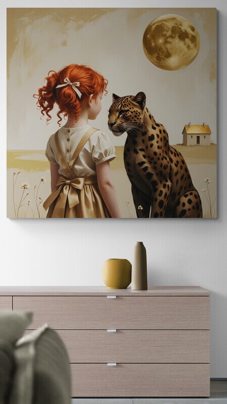 Een beeld dat spreekt zonder woorden: een meisje met koperrode krullen staat oog in oog met een luipaard. De gouden maan hangt stil boven het landschap, terwijl op de achtergrond een klein huisje met gouden dak verschijnt. Deze kunst roept vragen op, raakt het onderbewuste en voegt magie toe aan elk interieur. Perfect als sfeervol middelpunt in een kamer met karakter.