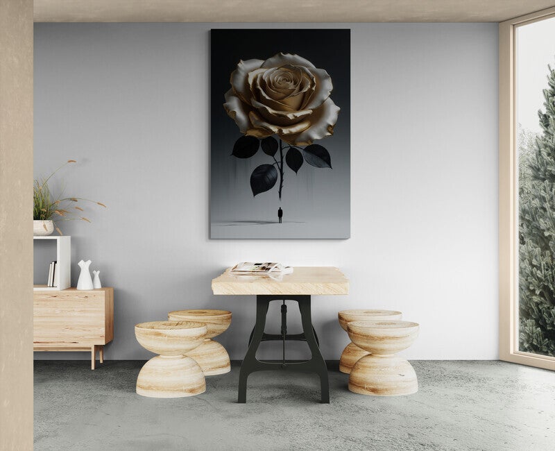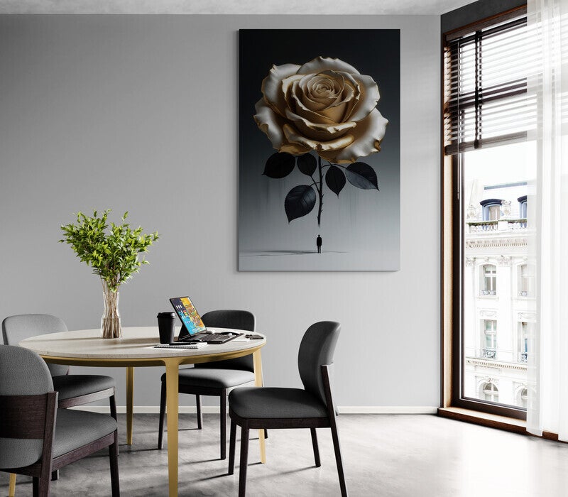 Een immense gouden roos torent stilzwijgend boven een klein, menselijk silhouet. Deze indrukwekkende compositie speelt met schaal, contrast en stilte. Het bladgoud glanst mysterieus tegen de sobere achtergrond, terwijl het donkere figuurtje onderaan uitnodigt tot reflectie. Is het bewondering, confrontatie of verwondering? Dit krachtige werk verenigt luxe en leegte, grootsheid en kwetsbaarheid – een statementstuk dat elke ruimte verandert.
