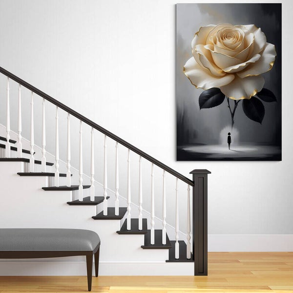 Een luxe en krachtig kunstwerk waarin een minimalistisch vrouwfiguur in zwarte lijnvorm staat onder een monumentale roos met gouden accenten. De combinatie van zwarte bladeren, ivoorwitte bloemblaadjes en goudranden maakt dit schilderij een tijdloos statement. Voor liefhebbers van serene verfijning en artistieke symboliek.