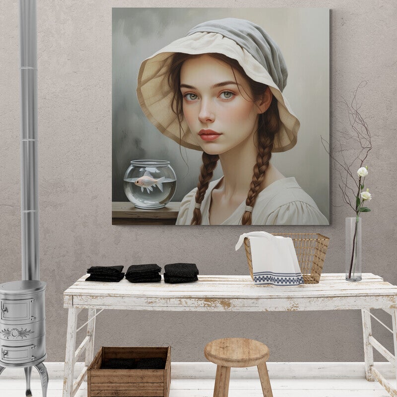 Een verstild en poëtisch kunstwerk waarin een jong meisje met vlechten rustig poseert naast een glazen viskom met een wit visje. De zachte kleuren, haar ingetogen blik en het symbolische gebruik van de vis creëren een sfeer van introspectie en kwetsbare kracht. Een portret dat fluistert in plaats van roept – perfect voor serene interieurs.
