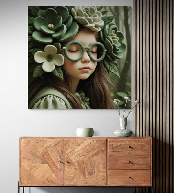 Een betoverend portret van een meisje met gesloten ogen, omringd door handgemaakte vilten bloemen in natuurlijke groentinten. De ronde vilten bril voegt een poëtisch en surrealistisch accent toe. Dit kunstwerk straalt rust, verbeelding en verbondenheid met de natuur uit en past prachtig in interieurs die geborgenheid en stilte omarmen.