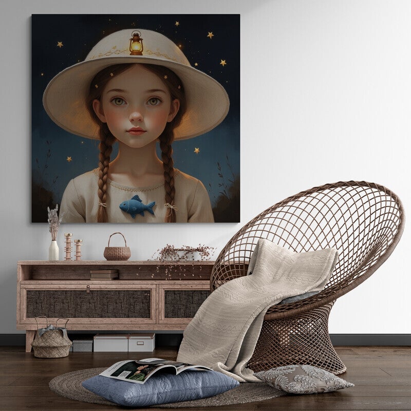 Schilderij van een meisje met linnen jurk, gouden sterren in het haar en een zacht verlichte hoed met lantaarn. De donkere achtergrond met fonkelende sterren zorgt voor een betoverende, bijna magische sfeer. De blauwe vis op haar jurk geeft een subtiele knipoog naar fantasie, zonder kinderlijk te worden. Een uniek kunstwerk dat past in een interieur met rustige tinten en een gevoel voor dromerigheid.