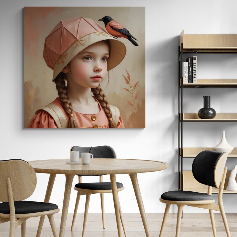 Een beeld van stilte en zachtheid. Dit kunstwerk toont een jong meisje met vlechtjes en een unieke geometrische hoed, waarop een zangvogel is neergestreken. De warme perzik- en terracottatinten, gecombineerd met het zachte textiel van haar kleding, geven het geheel een serene, bijna tijdloze uitstraling. Perfect voor wie een rustige sfeer wil creëren met een vleugje nostalgie aan de muur.