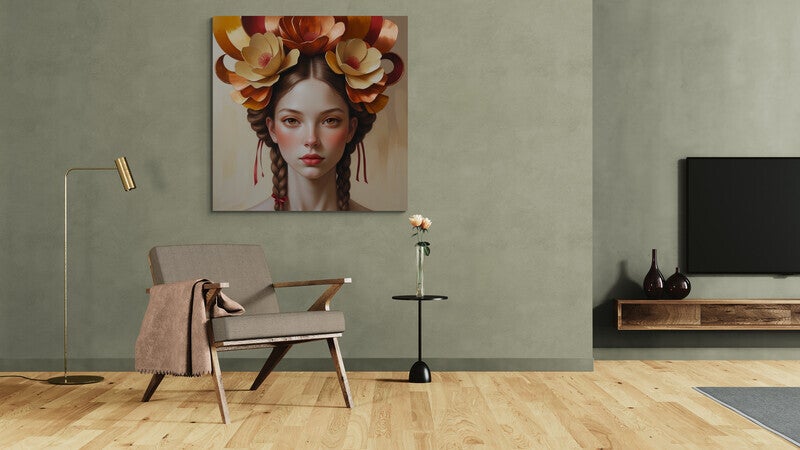 Een krachtig portret van een jong meisje met een bloemkroon in warme oranje- en geeltinten. Haar zachte blik en symmetrische vlechten worden omlijst door sculpturale bloemen, wat dit kunstwerk een bijzondere uitstraling geeft. De combinatie van strakke vormen en dromerige verfstructuur zorgt voor een stijlvol statement aan de muur.