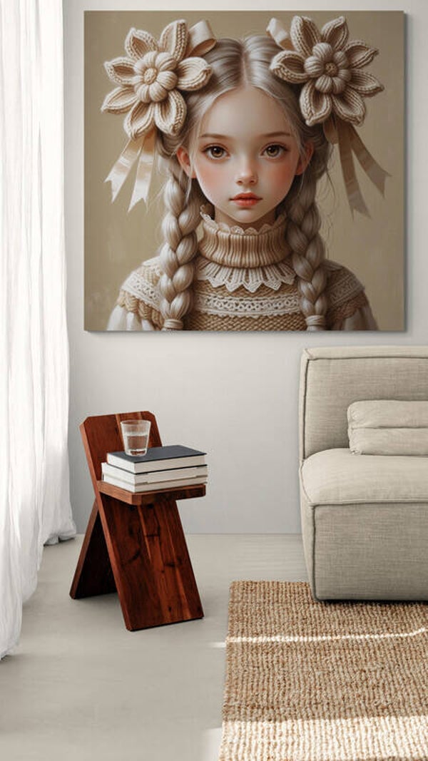 Een verfijnd portret van een meisje met zilverblonde vlechten, versierd met grote gebreide bloemen in zachte tinten. Haar warme coltrui, kanten details en natuurlijke uitstraling zorgen voor een harmonisch geheel dat perfect past in een rustgevend interieur. De kleuren ademen zachtheid en rust, terwijl het handwerkgevoel het werk een unieke, nostalgische charme geeft.