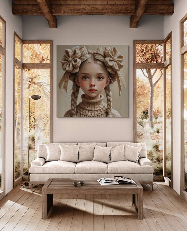 Een zacht en verstild portret van een meisje met lange vlechten en een warme coltrui, versierd met grote gebreide bloemen als haarstrikken. De uitstraling is puur en poëtisch, met een dromerige blik en een natuurlijke kleurstelling die elk interieur kalmte brengt. Dit schilderij ademt een knusse, tijdloze charme — alsof de stilte van een winterochtend gevangen is in beeld.