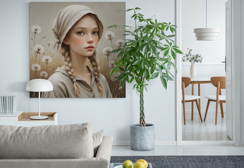 Een verstild portret van een jong meisje met twee blonde vlechten, omringd door pluizige paardenbloemen. Haar blik is zacht en introspectief, haar linnen kleding en hoofddoek stralen eenvoud en rust uit. De uitgebalanceerde aardetinten en dromerige compositie maken dit kunstwerk perfect voor een rustig interieur met een natuurlijke uitstraling.
