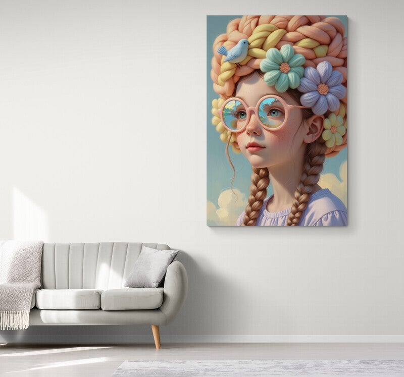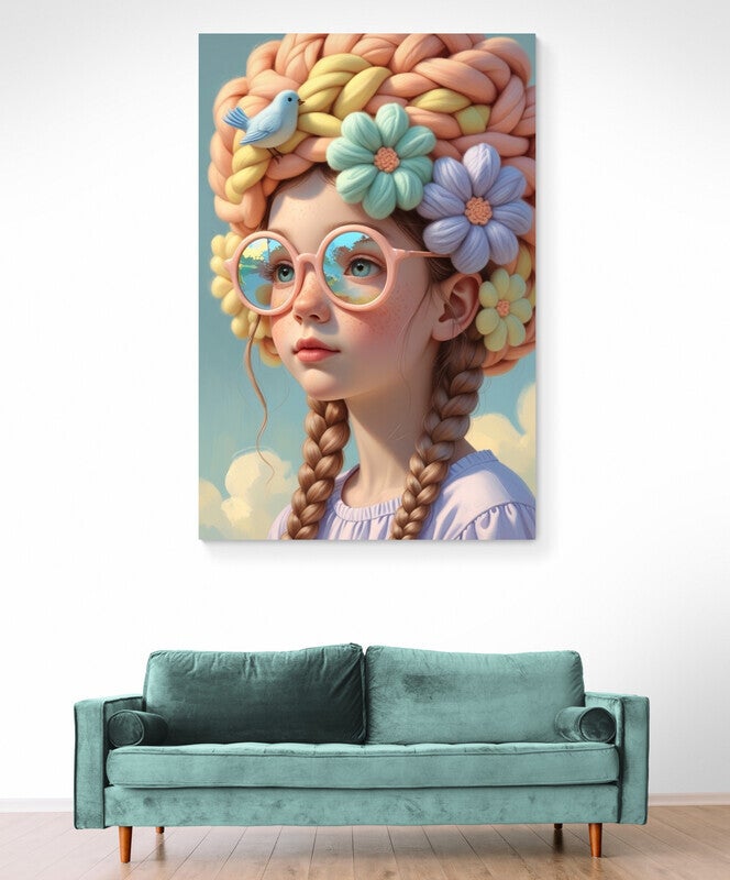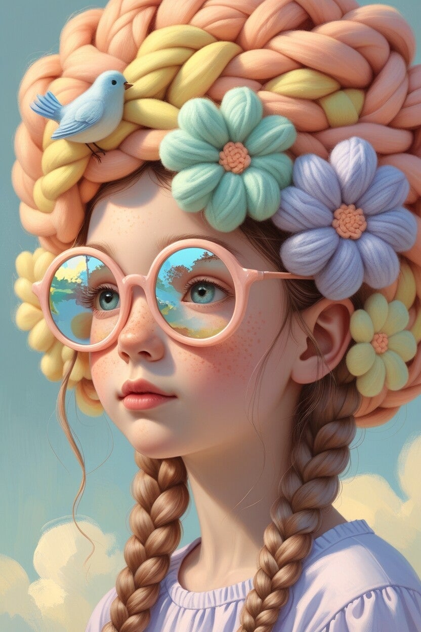 Een levendig kunstwerk van een meisje met zachte vlechten en een uitbundig kapsel van dikke pastelkleurige strengen, versierd met gebreide bloemen en een klein blauw vogeltje. In haar ronde bril weerspiegelt een vredig landschap, wat het geheel een extra poëtische lading geeft. Deze wanddecoratie straalt verwondering, zachtheid en creativiteit uit en past perfect in een modern, artistiek of kleurrijk interieur.