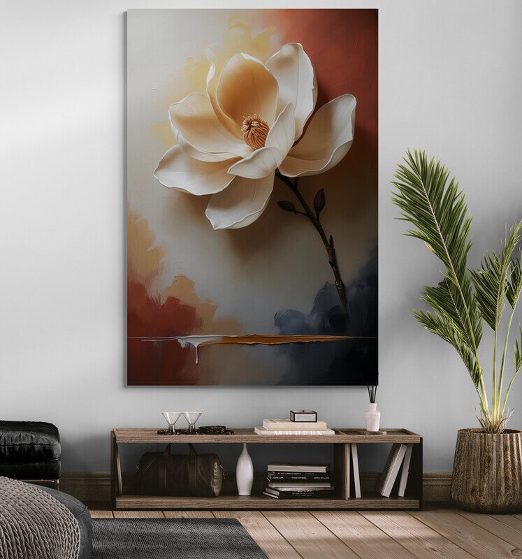 Een poëtisch kunstwerk van een witte magnolia die zich sierlijk opent tegen een achtergrond van warme aardetinten en zachte penseelstreken. De fluweelachtige bloemblaadjes lijken haast uit het doek te komen, met een spel van licht en schaduw dat diepte en elegantie toevoegt. Dit schilderij brengt een rustgevende, landelijke sfeer in elke ruimte en past perfect bij een naturel, warm interieur.