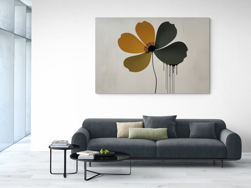 Abstracte bloemvorm, strakke vlakken, druipend effect, contrastrijke kleuren, grafische stijl, matte achtergrond