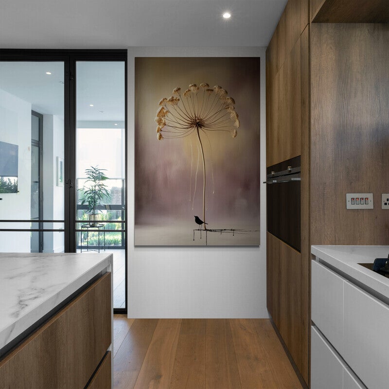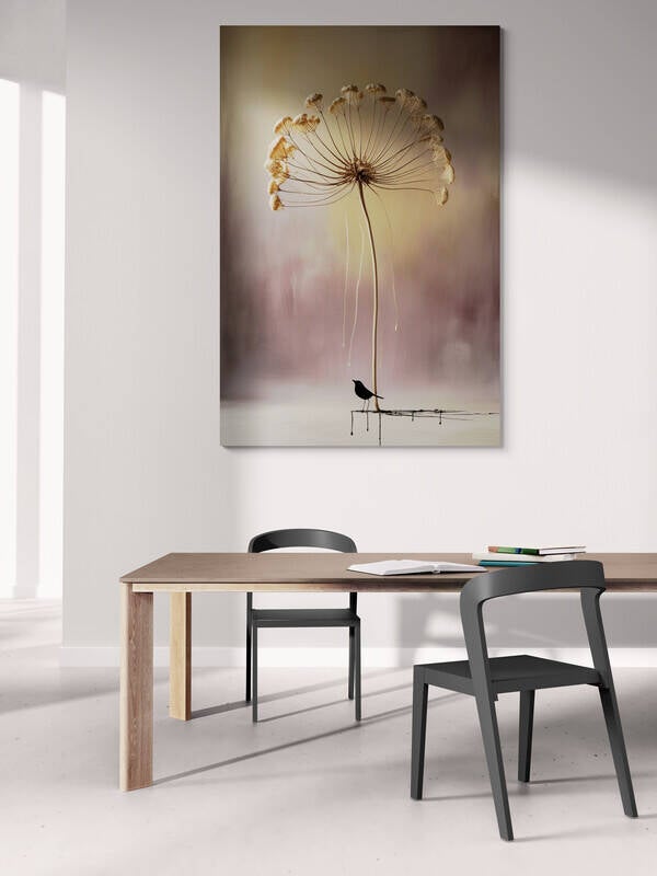 Inktflora is een kunstwerk dat stilte en symboliek combineert in een bijna poëtisch beeld. De fragiele lijnen van de berenklauw reiken als een grafische bloem omhoog, terwijl een zwarte silhouetvogel in de hoek het werk aards houdt. De warme, zachte tinten van paars, beige en sepia geven het geheel een troostrijke uitstraling die past bij verstilling en natuurlijke elegantie. Een bijzonder botanisch werk dat goed tot zijn recht komt in serene ruimtes.