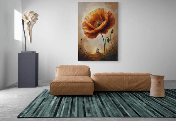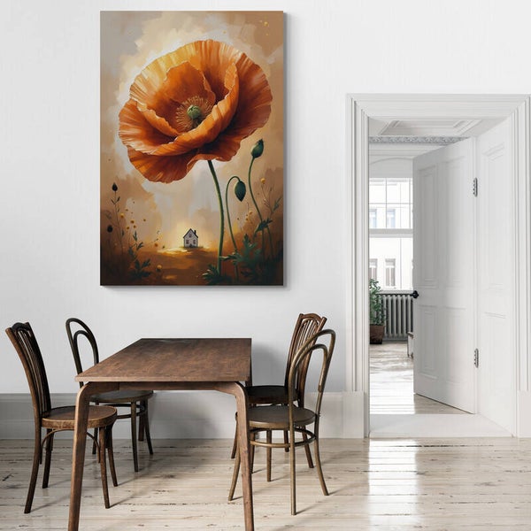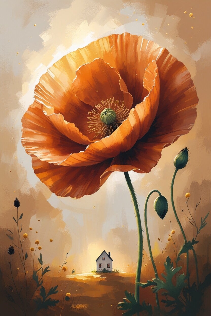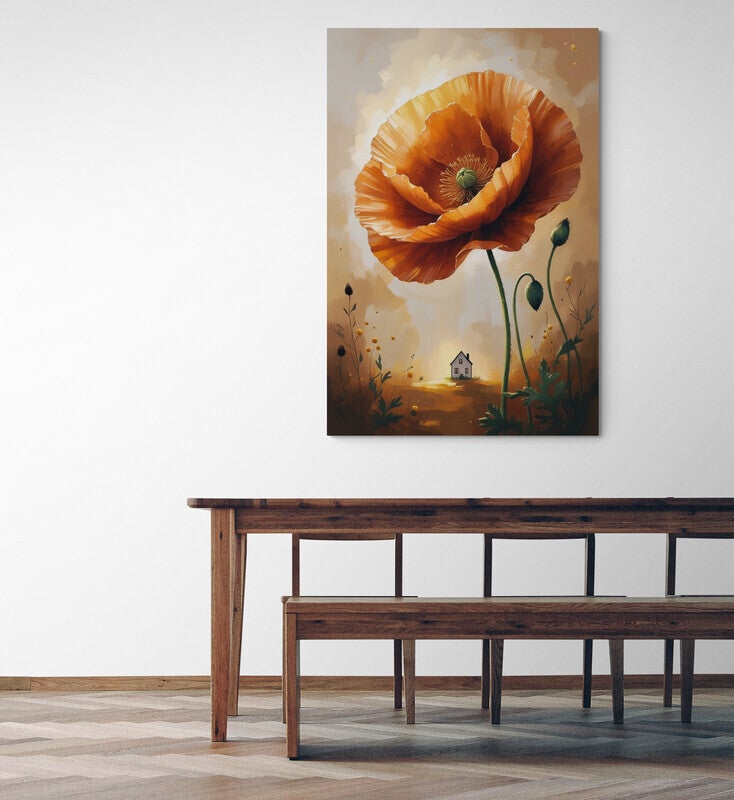 Veldlicht toont een reusachtige klaproos die zich als een beschermende bloem boven een klein huisje buigt. De compositie roept een gevoel van geborgenheid op, met een droomachtige gloed en gouden accenten die het geheel warmte en magie geven. Dit kunstwerk speelt met schaal en licht, en brengt een vleug poëtische fantasie in elke ruimte.