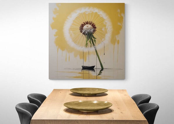 ‘Silent Impact’ is een krachtig en kunstzinnig schilderij waarin een grote paardenbloem zacht afsteekt tegen een intens okergele achtergrond. Onderaan het beeld dobbert een klein zwart bootje, verbonden met de steel via druipende verfdraden. Het resultaat is een surrealistisch, modern kunstwerk dat zowel kwetsbaarheid als kracht uitstraalt. Perfect voor een stoer interieur met karakter.