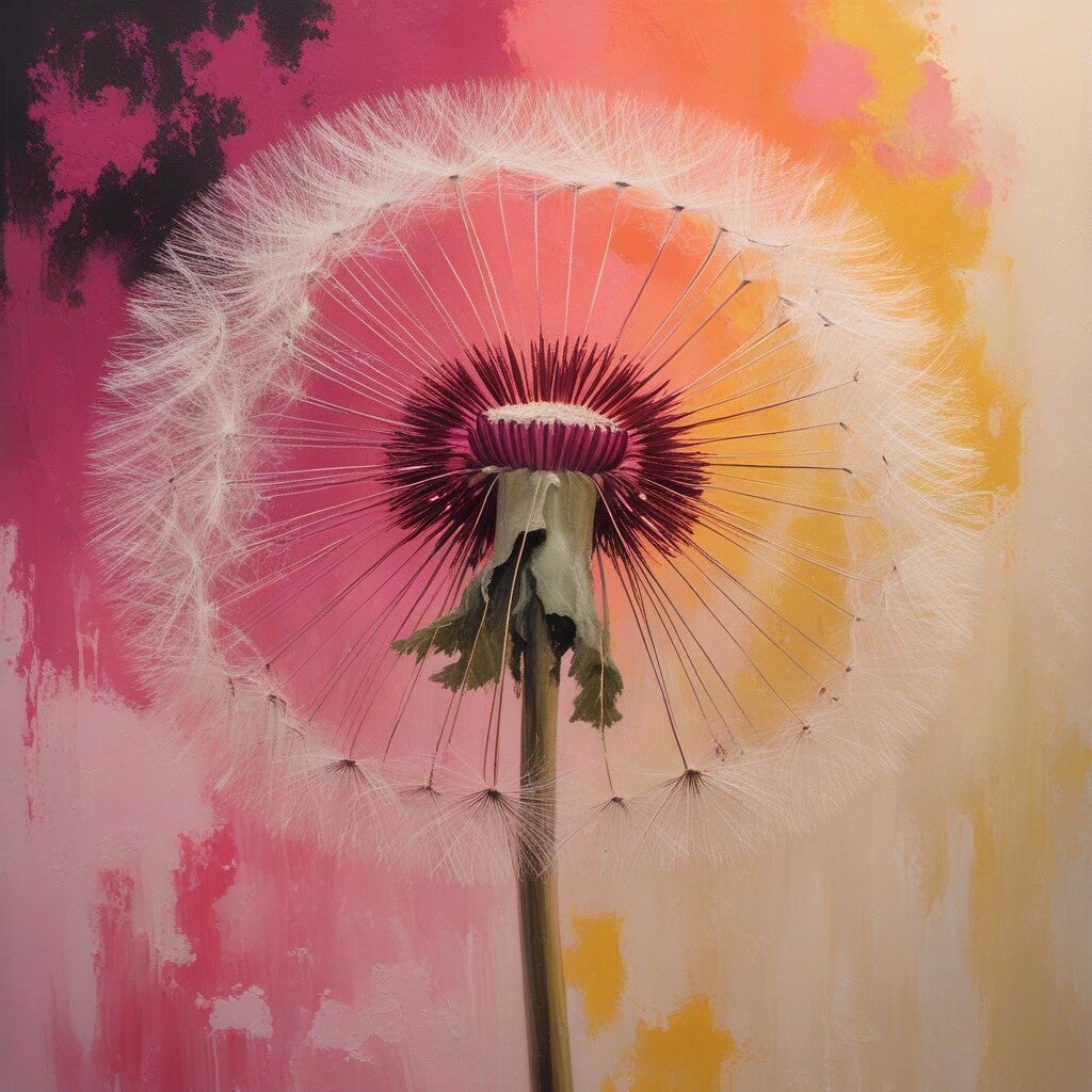 paardenbloem met witte pluisjes, kleurrijke achtergrond, sterke bloemkern, felle tinten, wanddecoratie met karakter
