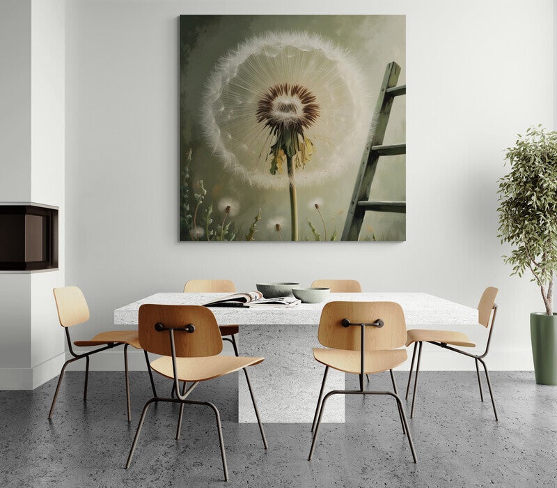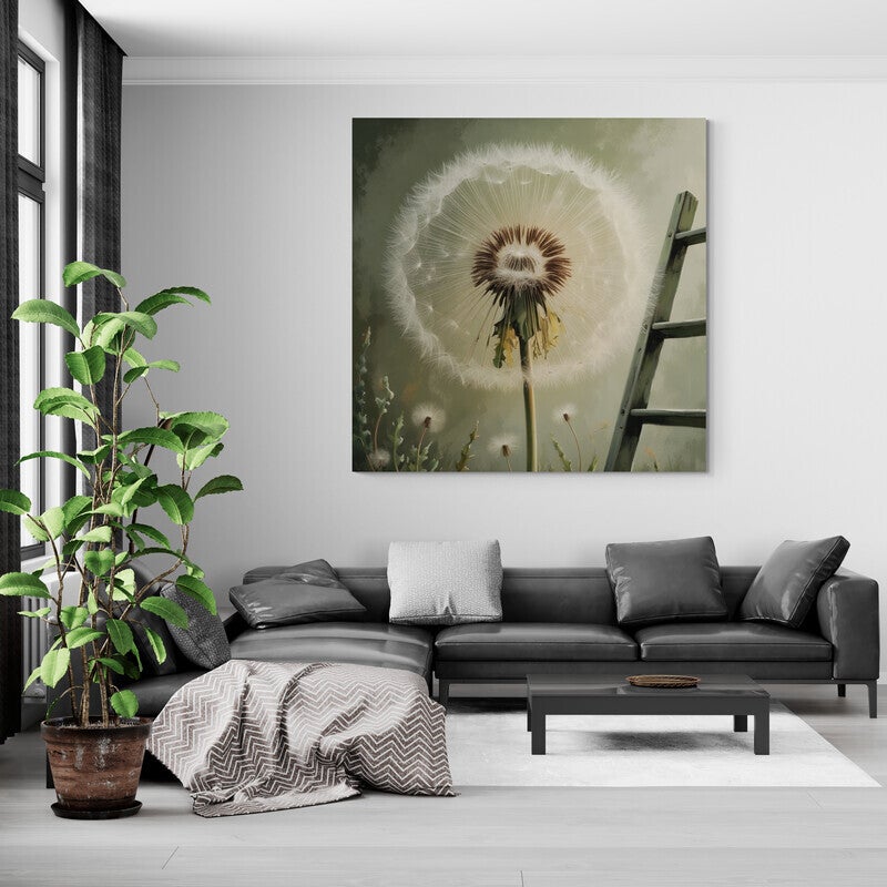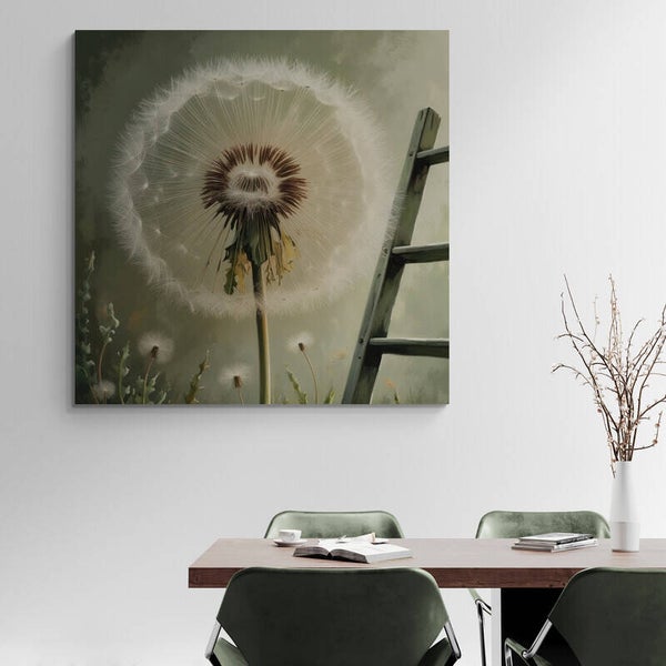 Cloudclimb & Zaadstof – schilderij met paardenbloem en ladder in groentinten