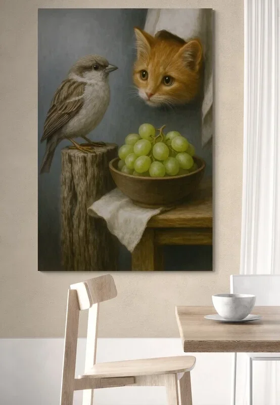 Een uniek schilderij waarin een nieuwsgierige roodharige kat, een mus en een schaal met druiven samenkomen in een intrigerende compositie. De blik van de kat, de kalme houding van de mus en de eenvoud van het stilleven zorgen voor een verhaal vol spanning en verwondering. Perfect voor wie houdt van sober wonen met een vleugje speelsheid.