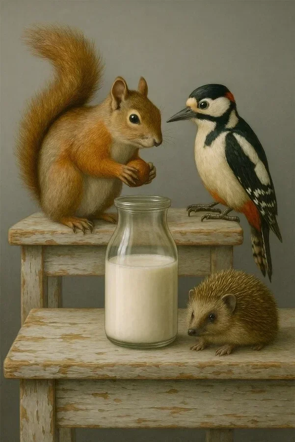Een speels en verfijnd schilderij waarin een eekhoorn, specht en egel samenkomen rond een fles melk. De zachte realistische stijl maakt dit kunstwerk uniek en sprookjesachtig. Het lijkt alsof de dieren een klein geheim delen, waardoor dit werk een charmante en verhalende uitstraling krijgt.