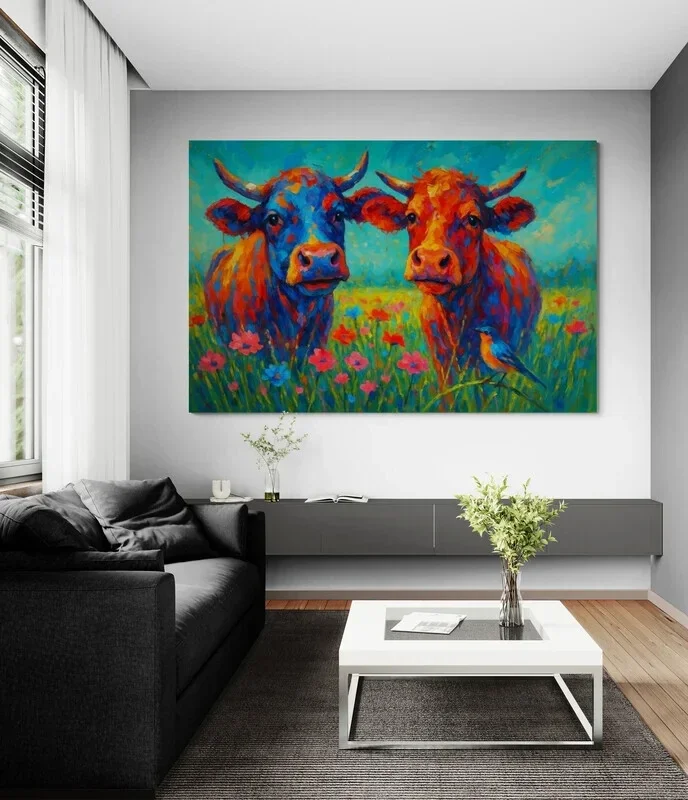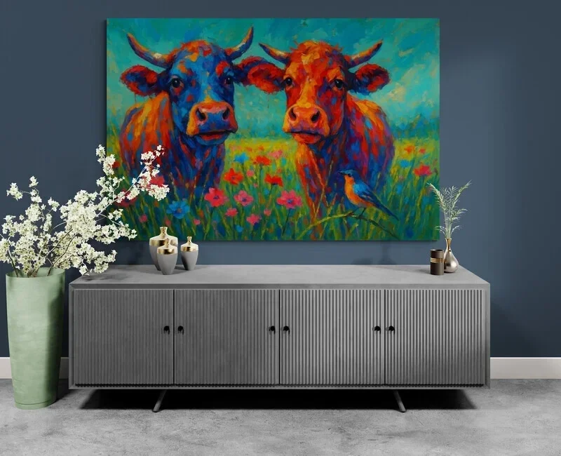 Een speels en levendig schilderij van twee vrolijke koeien te midden van een bloeiende weide. De felle kleuren en expressieve penseelstreken geven het kunstwerk een vrolijke en eigentijdse uitstraling. Dit kunstwerk brengt landelijke charme gecombineerd met moderne kunst in elke ruimte, en zorgt voor een positieve en warme sfeer in huis.