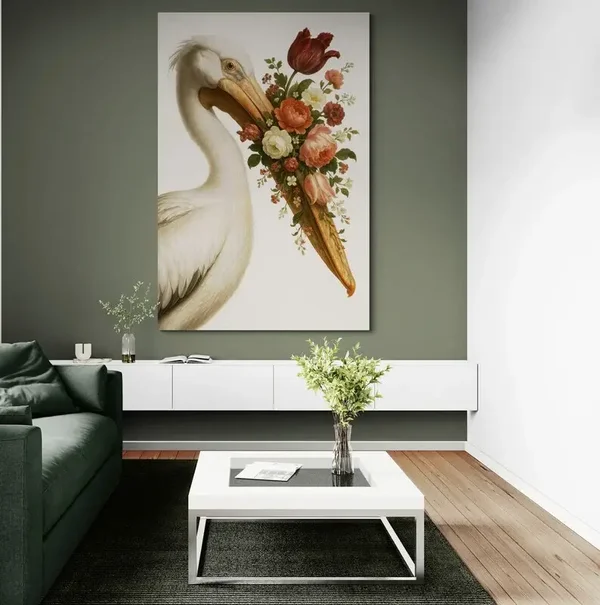 Een elegante pelikaan met een opvallend boeket bloemen in zijn snavel, geïnspireerd op de bloemstillevens van de oude meesters uit het Rijksmuseum. De combinatie van natuur, symboliek en verfijning maakt dit werk tot een rustgevend en stijlvol schilderij voor elk interieur. De zachte tinten en klassieke compositie brengen direct warmte en kunstzinnigheid in huis.
