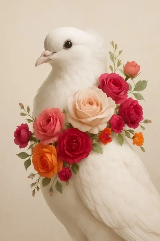 Een betoverend schilderij van een elegante witte duif, versierd met een rijk boeket van rozen en bloemen in warme tinten. De zachte crèmekleurige achtergrond benadrukt de rust en zuiverheid van het beeld. Perfect voor een romantisch interieur, een zachte sfeer in de slaapkamer of als symbolisch kunstwerk in een serene ruimte.