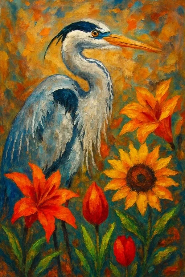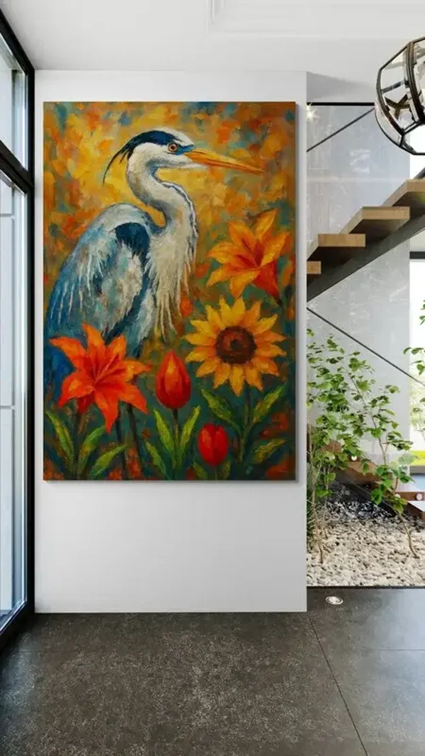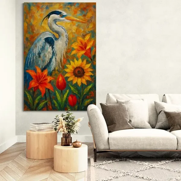 Een sfeervol schilderij met een elegante reiger tussen opvallende bloemen zoals zonnebloemen, tulpen en lelies. De achtergrond is geschilderd in warme tinten die het geheel een levendige en vriendelijke uitstraling geven. De reiger staat statig in het midden en vormt samen met de bloemen een kleurrijk geheel voor aan de muur.