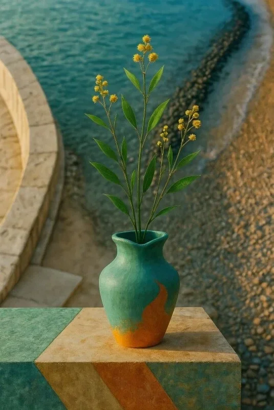 Turquoise vaas bij zee – schilderij met gele bloemen/🖤 Black Friday