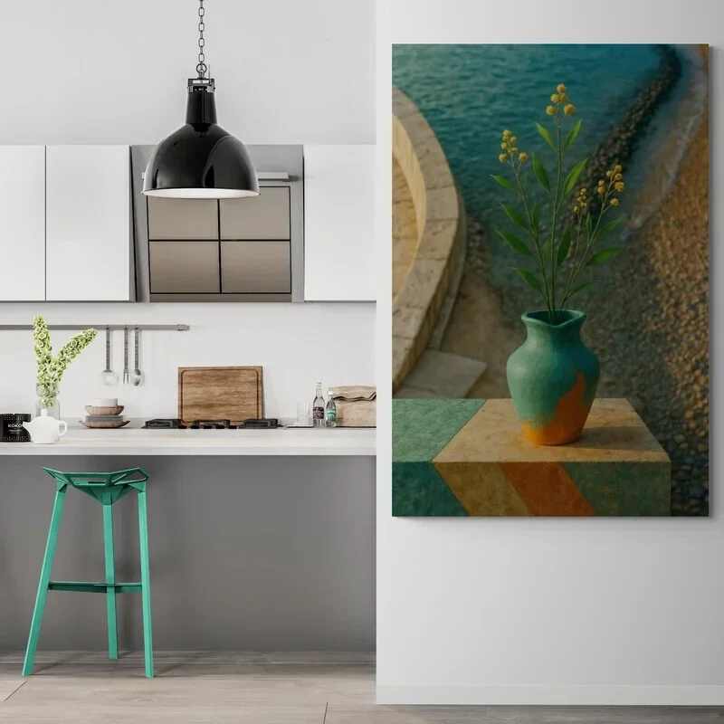 Een rustig, zomers beeld: een turquoise vaas met slanke takjes en gele bloemetjes staat op een muurtje aan het water. De stenen kade, het zachte licht en het zeeblauw geven dit werk een ontspannen mediterrane sfeer. Perfect als frisse blikvanger in huis.