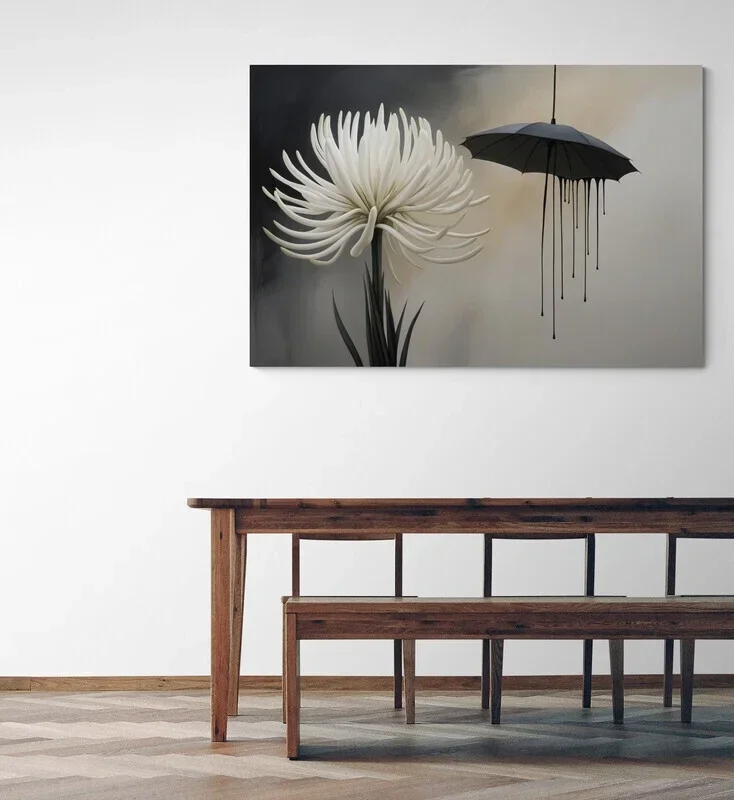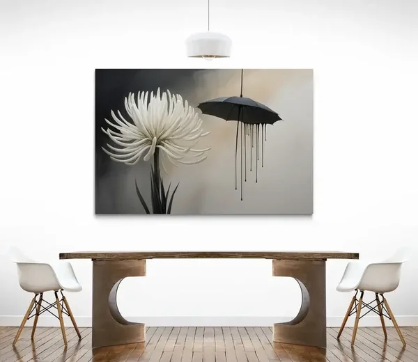 witte abstracte bloem, zwarte paraplu, druppels, ingetogen achtergrond, sterke compositie, kunstzinnig contrast