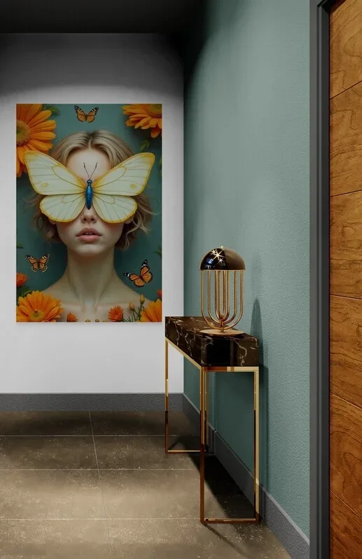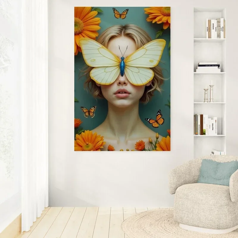 Papillon Bloom is een betoverende kunstprint waarin natuur en vrouwelijkheid samensmelten in een surrealistisch portret. Een grote vlinder vormt op magische wijze een masker over de ogen van een jonge vrouw, omringd door warme oranje bloemen en fladderende monarchvlinders. Perfect voor wie houdt van dromerige, vrouwelijke en fantasierijke kunst met een symbolische gelaagdheid.
