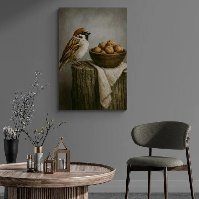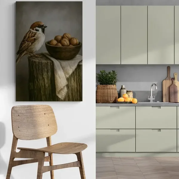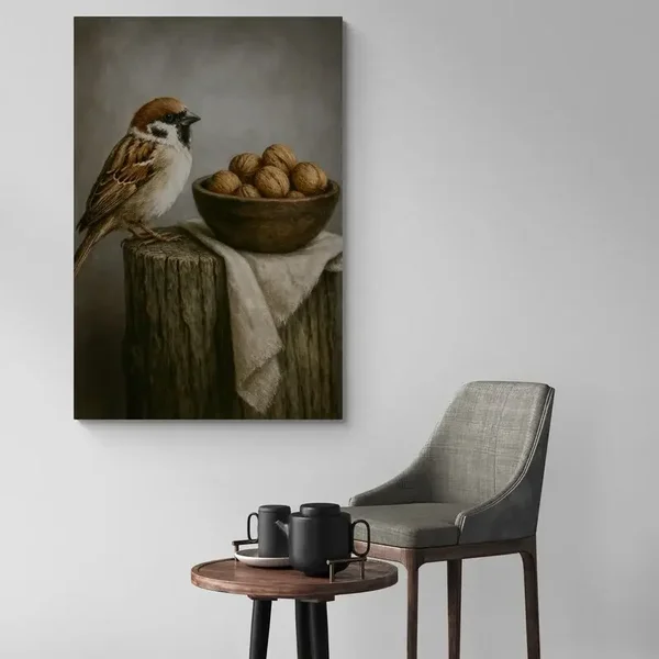 Een sfeervol schilderij van een mus die nieuwsgierig naast een houten schaal met walnoten zit. Het geheel is uitgevoerd in warme, natuurlijke tinten en straalt eenvoud en rust uit. Een kunstwerk dat perfect past binnen de stijl van sober wonen en landelijk interieur.