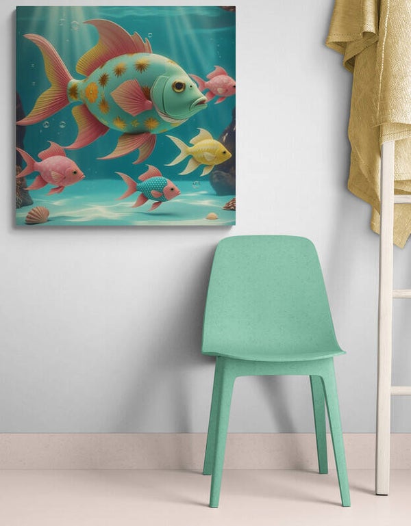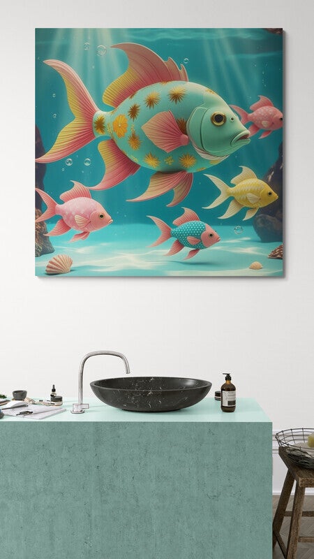 Een sfeervol retro kunstwerk met een grote decoratieve vis in mintgroen en koraal, omringd door kleinere vissen met speelse patronen. De illustratieve stijl, zachte pasteltinten en vintage details geven dit werk een unieke uitstraling. Het ontwerp creëert een rustige, fantasierijke sfeer die past in moderne en nostalgische interieurs.