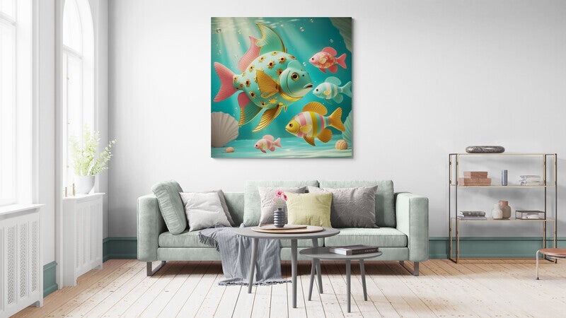 Een uniek retro kunstwerk met een grote vis in mintgroen en goudaccenten, omlijst door kleinere vissen met zachte patronen en pasteltinten. De illustratieve stijl, gedetailleerde bloemmotieven en elegante gouden lijnen geven dit ontwerp een rijke, decoratieve uitstraling. Het geheel ademt een rustige, fantasierijke sfeer die perfect past in zowel moderne als nostalgische interieurs.