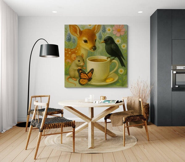 Een zacht en vriendelijk tafereel waarin een jong hertje, een muis, een vogel en een vlinder samenkomen rond een kop warme koffie. De bloemen op de achtergrond en de zachte lichtval geven het kunstwerk een lichte, bijna dromerige sfeer. De combinatie van dieren, kleur en rust maakt dit schilderij ideaal voor een keuken, kinderkamer of een cozy hoekje in huis.