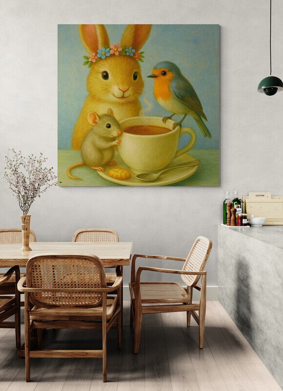 Een zacht en vriendelijk tafereel waarin een konijn met bloemenkrans, een kleine muis en een roodborstje samenkomen rond een warme kop koffie. De lieve blik van het konijn, de zachte kleuren en het rustige blauwe licht geven dit schilderij een warme, uitnodigende sfeer. De combinatie van bloemen, dieren en een koffiemoment maakt dit kunstwerk ideaal voor keuken, kinderkamer of een gezellig hoekje in huis.