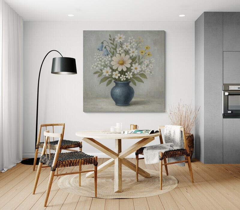 Een zacht en landelijk schilderij van een klassiek blauw vaasje gevuld met witte en gele bloemen. De verfijnde penseelstreken en rustige kleuren geven het kunstwerk een warme en natuurlijke uitstraling. Dit tijdloze bloemenboeket past moeiteloos in landelijke, klassieke en lichte interieurs.