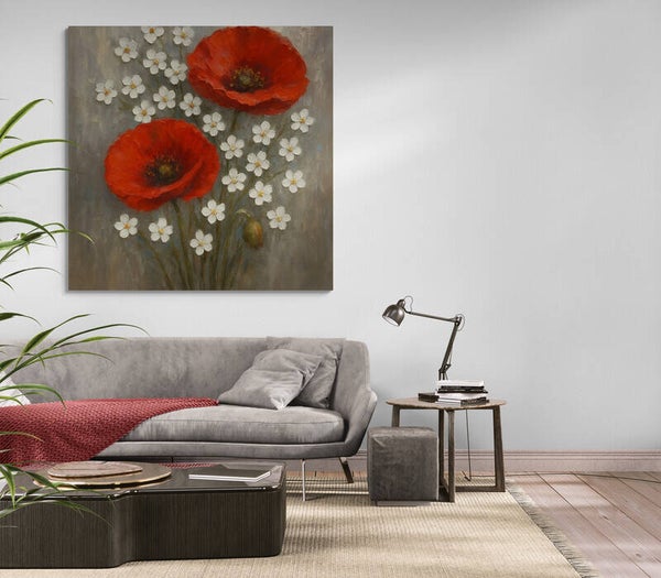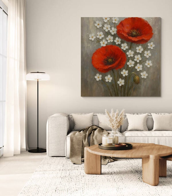 Een sfeervol schilderij met twee grote rode klaprozen die prachtig afsteken tegen een zachte, landelijke achtergrond. Daaromheen kleine witte veldbloemen die het geheel een frisse en natuurlijke uitstraling geven. De rijke textuur en warme penseelstreken maken dit kunstwerk ideaal voor elke ruimte waar rust, natuur en kleur samen mogen komen.