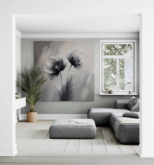 Dit elegante schilderij in grijstinten brengt rust en verfijning in elke ruimte. De twee bloemen zijn met krachtige penseelstreken neergezet, waardoor het kunstwerk zowel zacht als stijlvol oogt. Perfect voor wie houdt van moderne, tijdloze wanddecoratie.
